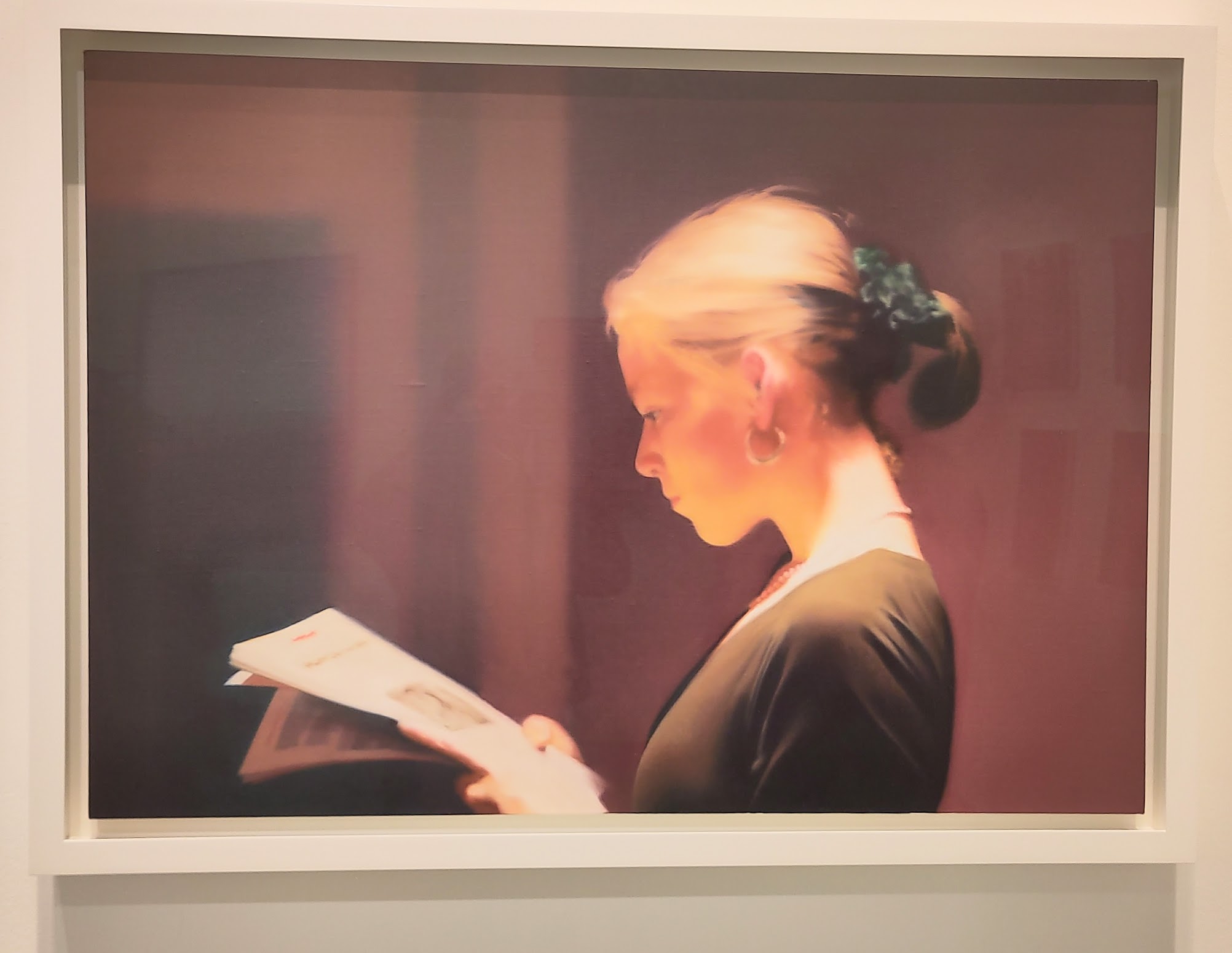 Ce portrait de Sabine en train de lire, d’une beauté classique, hyperréaliste avec un très léger flou, démontre à quel point la technique de l’artiste est au sommet de son art. Je me réjouis qu’il ne l’aie pas triturée! Beaucoup l’assimile à un Vermeer. Ombre et lumière se conjuguent pour évoquer une intimité chaleureuse, un repli sur soi, un recueillement. Personnellement je la trouve empreinte de mysticisme.