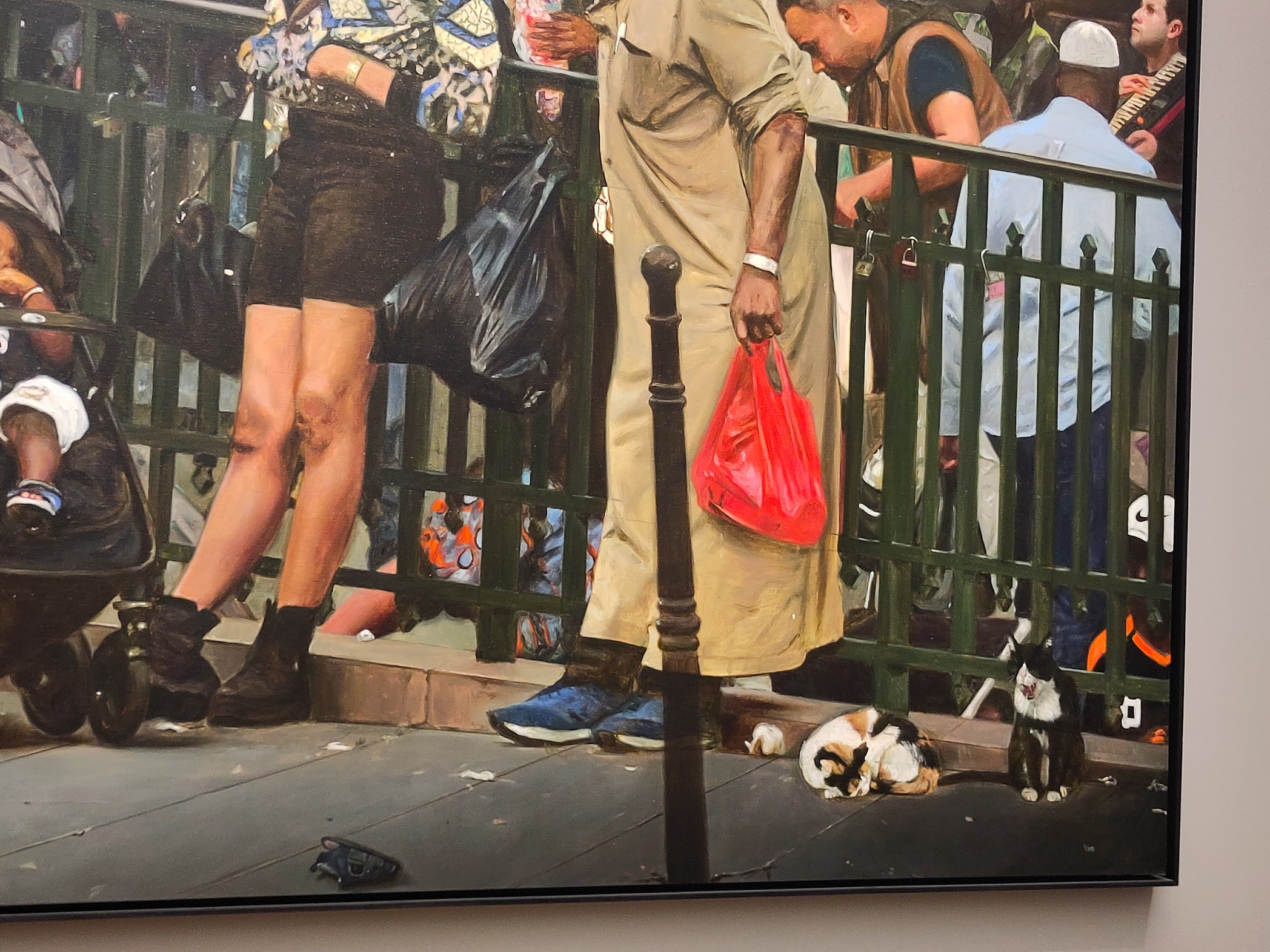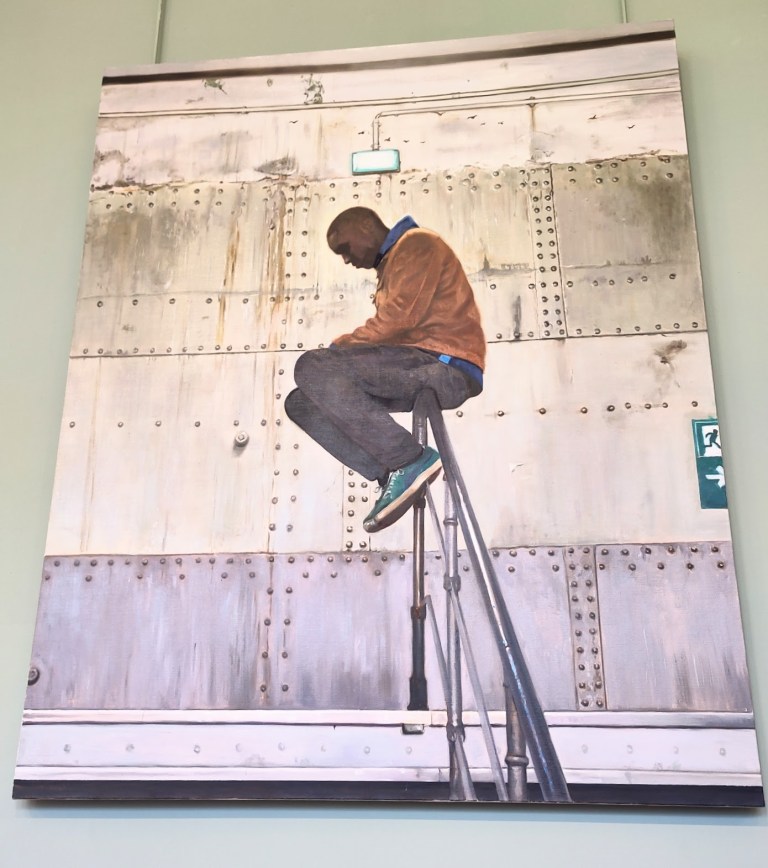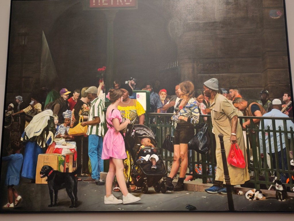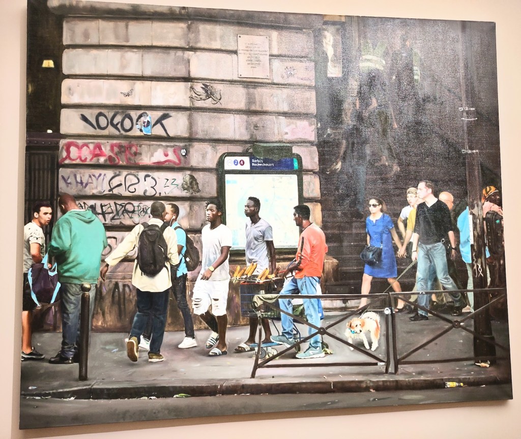 L’atelier du peintre de Courbet, cité par une affiche en haut à droite, décrivait la diversité de la population dans une scène de genre, un portrait de société. « Ce sont les gens qui vivent de la vie, qui vivent de la mort. C’est la société dans son haut, dans son bas, dans son milieu. En un mot, c’est ma manière de voir la société dans ses intérêts et ses passions. C’est le monde qui vient se faire peindre chez moi » déclarait Gustave Courbet. Dans le flux suspendu du passage de ces personnes actuelles, Hamdad dépeint le métissage social aperçu à la sortie du métro Barbès- Rochechouart.