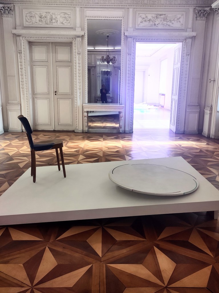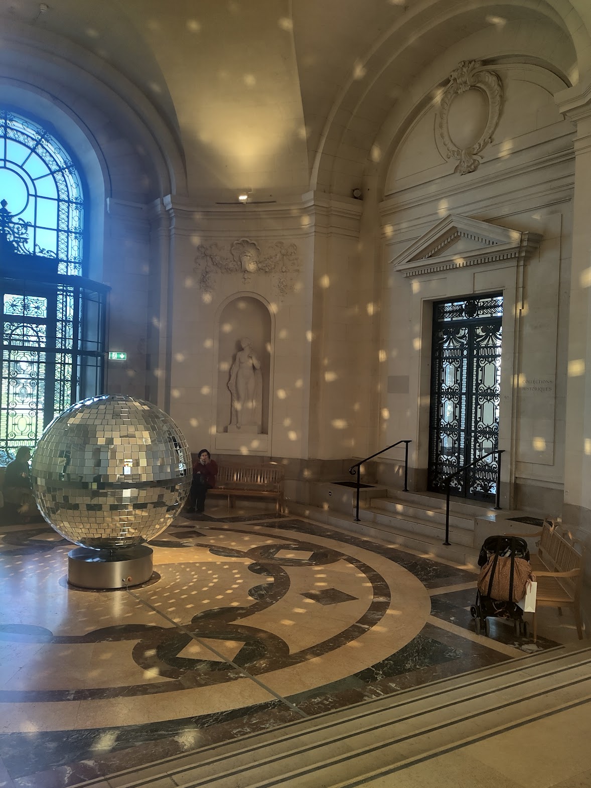 La boule à facettes tournante du hall d’entrée chamboule l’ancienneté du lieu en projetant des constellations lumineuses tout autour d’elle. Un readymade qui n’en est pas vraiment un puisque l’objet monumentalisé a été créé pour l’occasion.