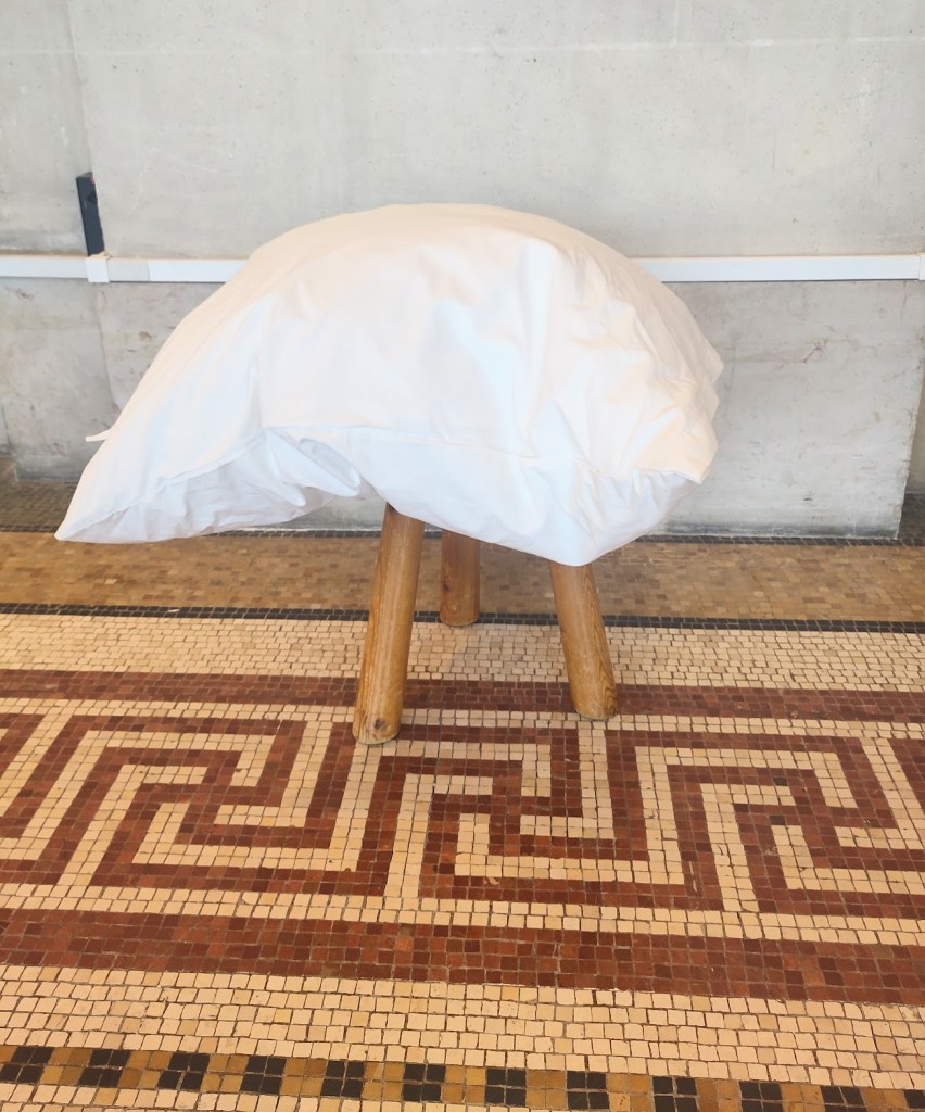 Clin d’oeil humoristique de l’artiste: Un animal à trois pattes? Un nuage fatigué du ciel? Une pensée pour le gardien du musée? ou pour le visiteur lassé de la station verticale?