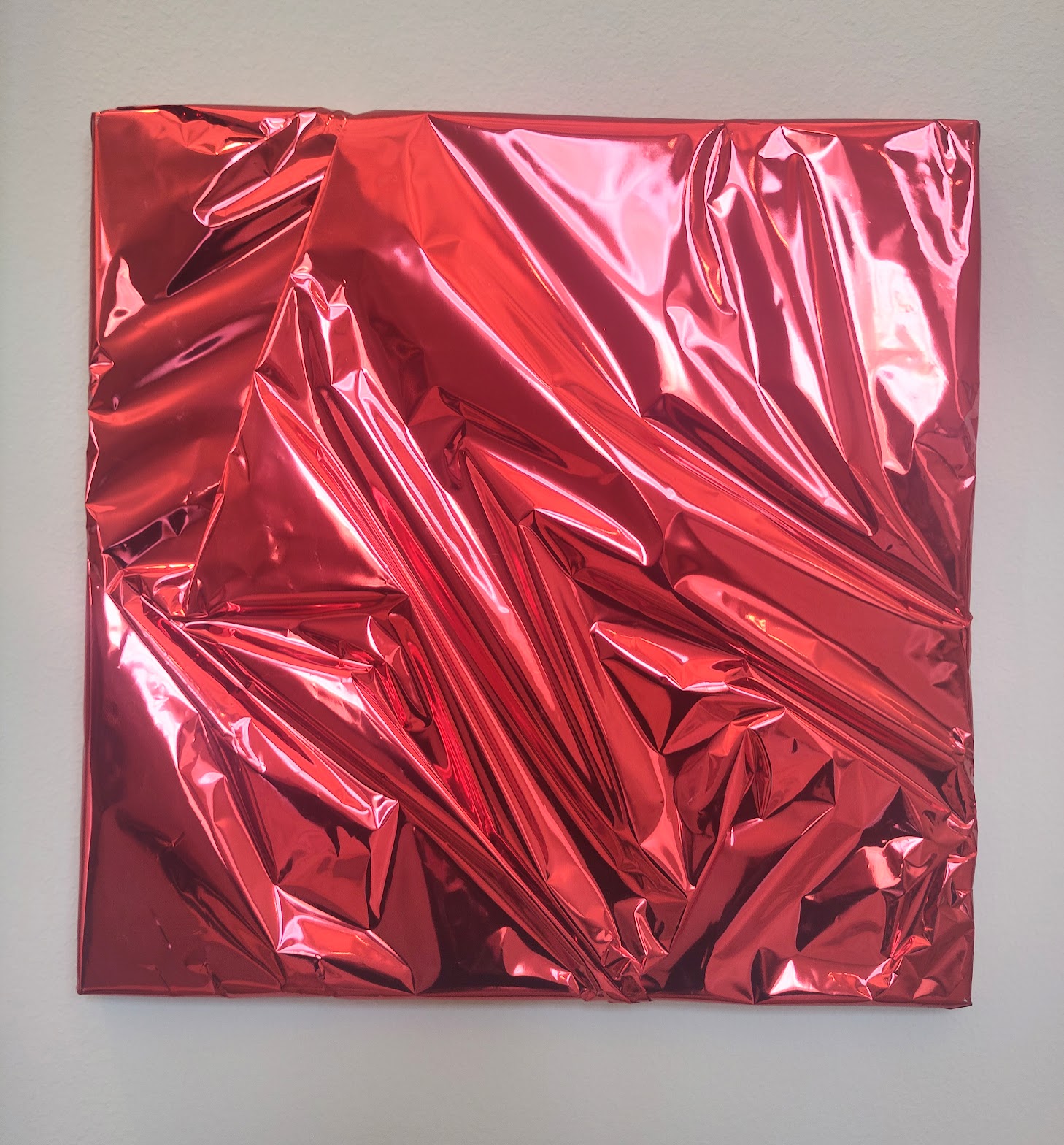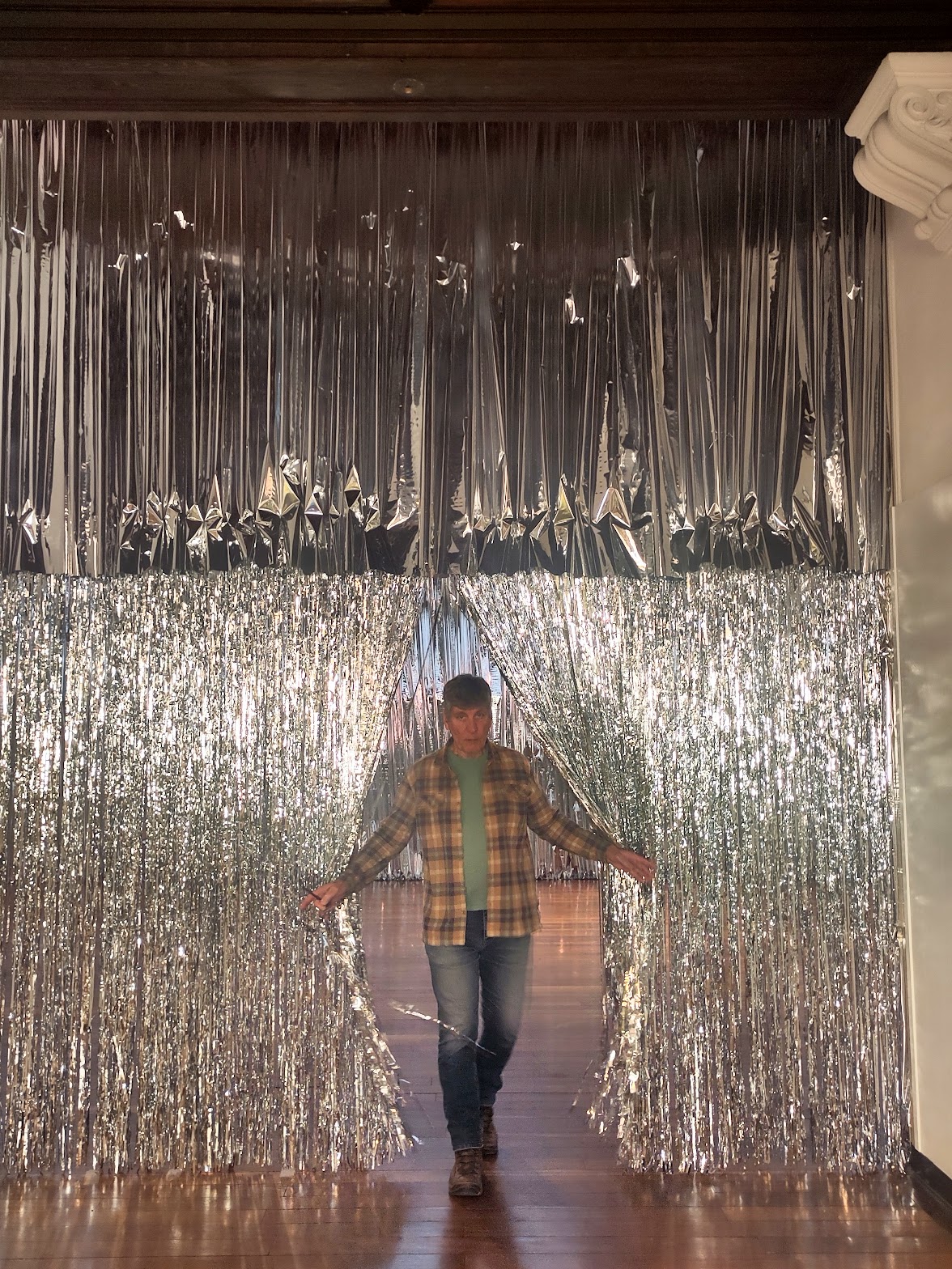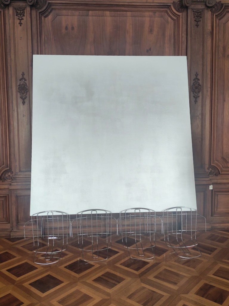 Le Vide empli la salle suivante celle habituellement consacrée aux armures de la collection. Armleder la vide de son contenu tout en l’habillant de vinyl argenté plissé comme des vêtements Miyake. Quelques cadres anciens, vidés de leur contenu artistique, deviennent ici aussi objets de regards pour eux-mêmes. Des trous percés dans le revêtement permettent de voir ce qu’il y a dans les vitrines: les armures, épées et autres objets médiévaux. Peut-être un clin d’oeil appuyé à « Etant donnés… », l’oeuvre de Marcel Duchamp qui rend les regardeur.euses voyeur.euses. Mais vous pouvez aussi faire une entrée fracassante par une frange ruisselante du rideau dans la salle de garde.