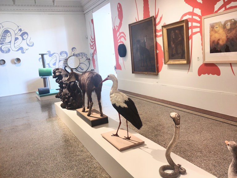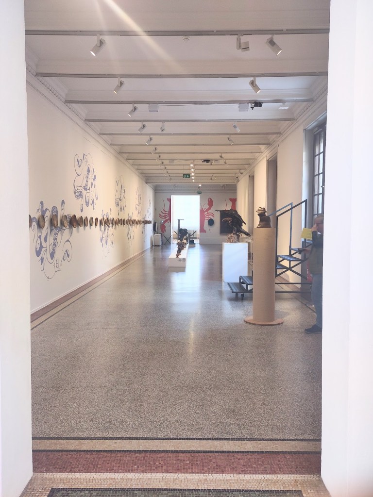 Deux salles sur le thème des animaux. Les cimaises ont été peintes de pieuvres mauves et de homards rouges. Les pieuvres soutiennent un ensemble de céramiques byzantines et les homards de petits tableaux animaliers de la collection. Au centre de chacune de ces salles oblongues, un podium traversant supporte deux séries d’animaux par ordre de grandeur. Naturalisés ou sculptés, ils défilent fièrement comme modèles d’artistes depuis la nuit des temps. Certains même semblent nous défier d’un air moqueur! Au fond, est projeté un film, « Les Amours de la pieuvre » de Jean Painlevé (1965) qui, je l’espère, contribuera à éradiquer leur consommation…