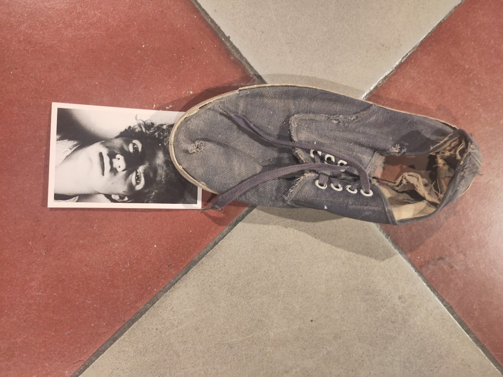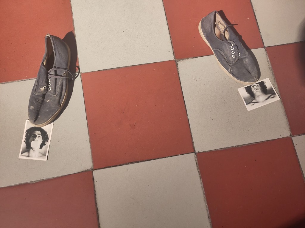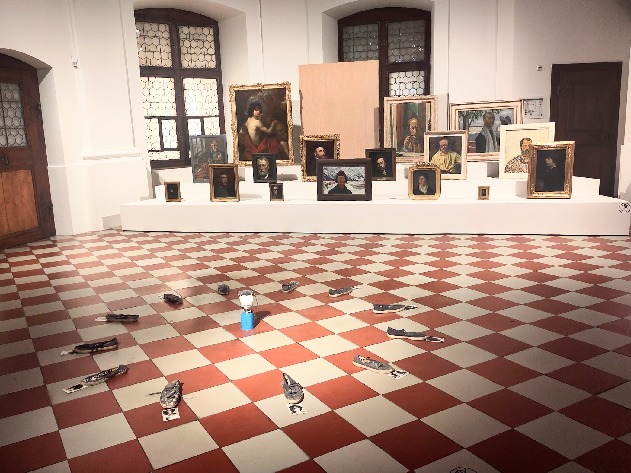 Je suis retournée me régaler de cette exposition et j’ai vu la salle des autoportraits que j’avais manqué lors de ma première visite. Une installation ouvre le bal visuel de ce lieu: de vielles tennis, toutes pareilles, entament une ronde qui m’évoque le zig zag zoug de mon enfance, une comptine dite pour désigner ou éliminer des participant.es au jeu. Mais elles sont tournées vers l’extérieur… comme autant de pas indiquant un autoportrait de l’artiste à différents moments de sa vie. Une lampe à gaz, comme une réminiscence duchampienne, trône au centre de la farandole. A cette danse assiste un public d’artistes, leurs regards fixés sur les visiteur.euses ou sur ce cercle formé par les images du tournoiement sans fin de John M Armleder.