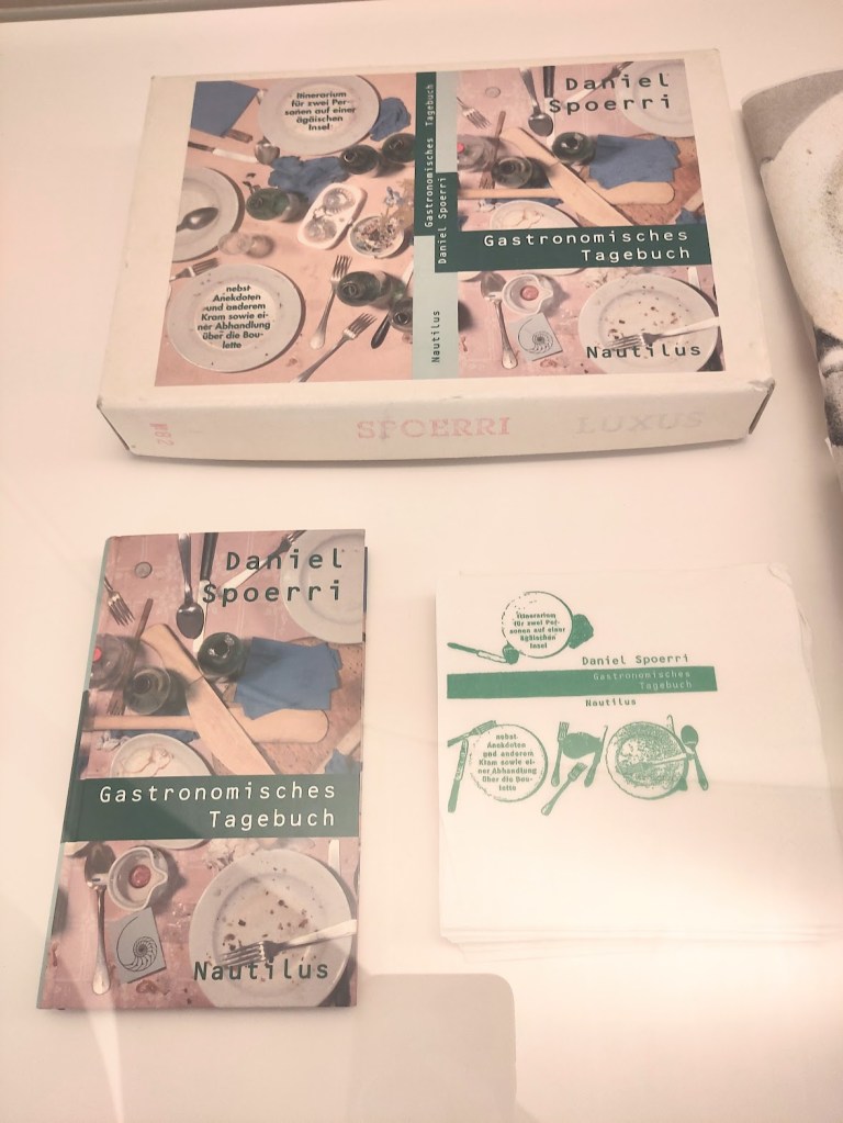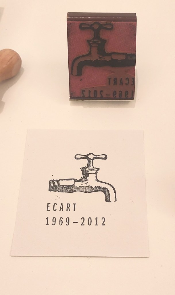 L’avant-dernière salle est celle des Livres et Tampons d’artistes. John M Armleder propose l’édition de timbres en caoutchouc d’artistes créés avec Ecart: proche de Fluxus, Ecart est tout à la fois un groupe d’artistes, un espace indépendant et une maison d’édition fondée en 1969, à Genève, par John M Armleder, Patrick Lucchini et Claude Rychner. Lire sur MAMCO. Il y a également des productions encadrées et la possibilité de tester les tampons (fac similé) sur place.