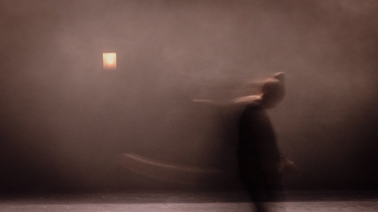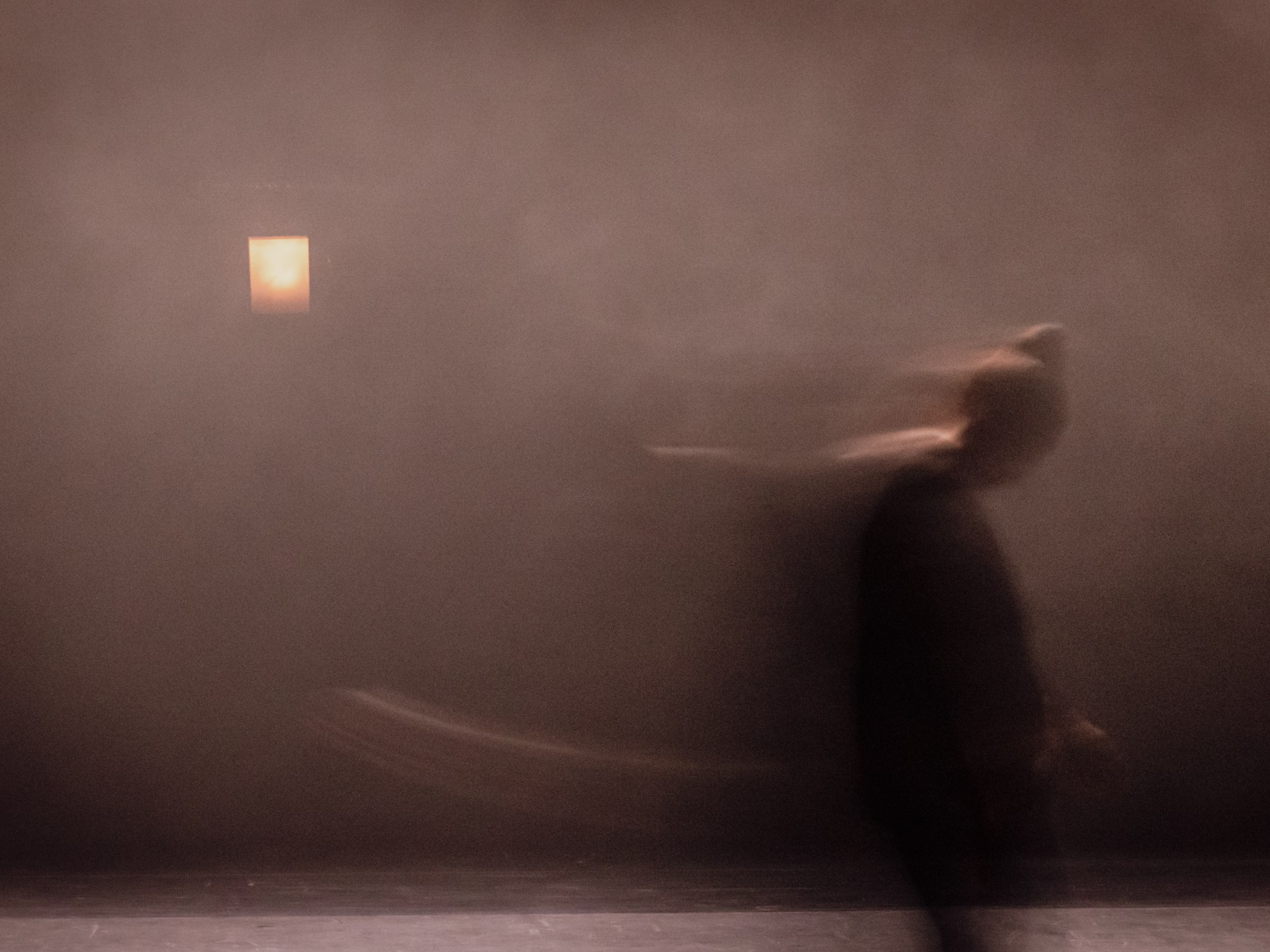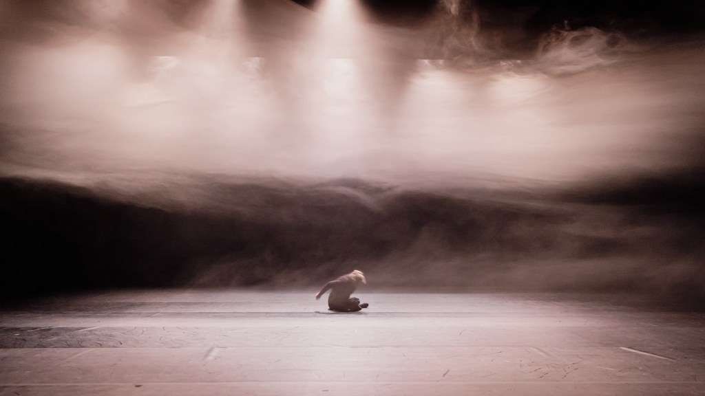 Les chants d’oiseaux participent à cet épisode. Malgré un bourdonnement qui peu à peu devient furieuse tourmente, leurs sifflements demeurent mélodieux. Dans un brouillard dense, une silhouette vague se met à remuer. Si lentement qu’il faut presque la quitter des yeux pour remarquer son changement de forme. Ou regarder son ombre dessiner des figures. Au centre de ce halo imperceptiblement lumineux, elle s’effondre au ralenti, tourne et se détourne. Nos yeux cherchent une forme humaine au coeur de cet effacement. Des nappes de brume flottent au-dessus d’elle.