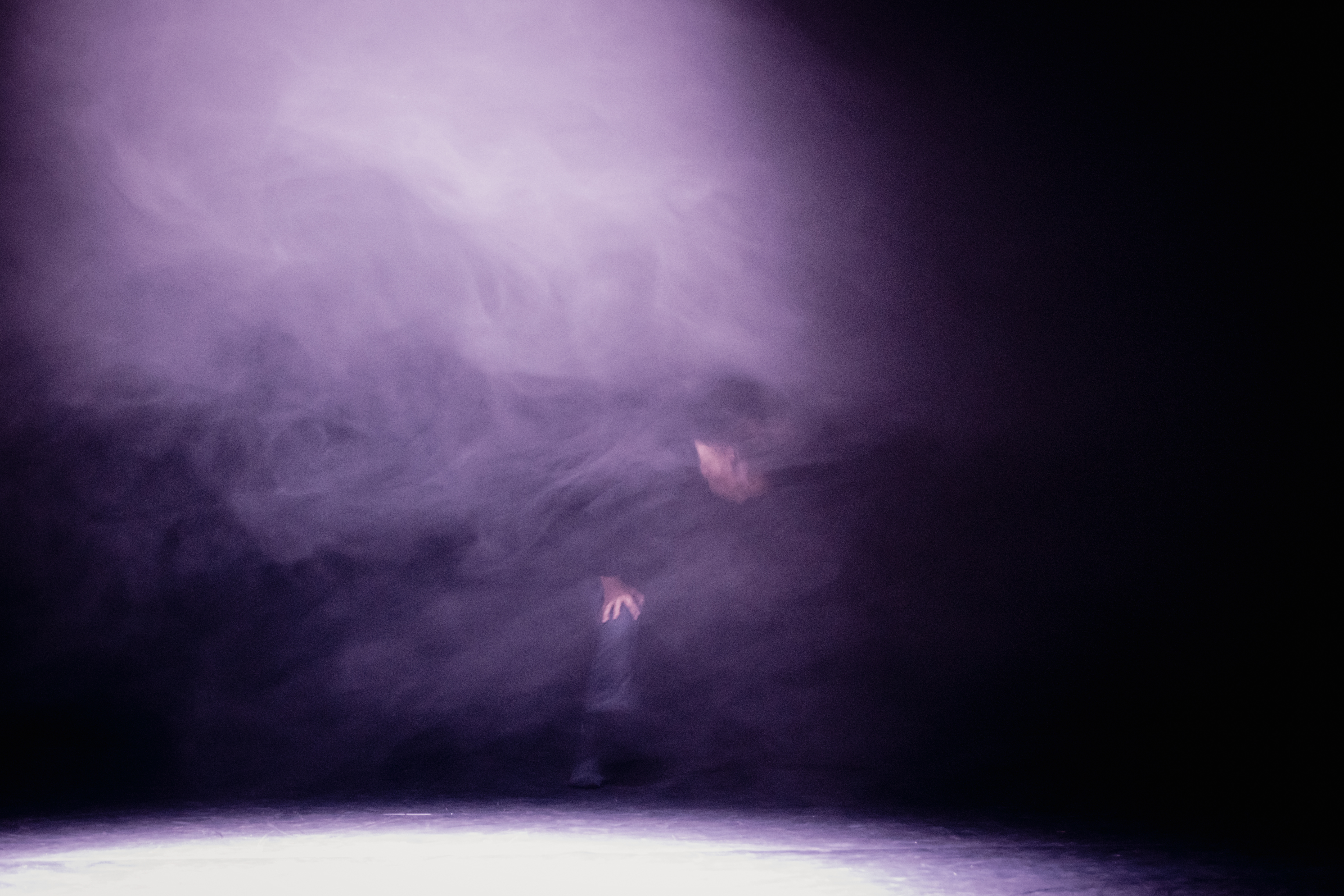 Obscurité. Les oiseaux ont disparu, relayés par plusieurs veilleuses lumineuses en hauteur. La silhouette se meut, elle se déplace, marche, tourne, virevolte. Et surtout elle disparaît et réapparaît… on dirait un oiseau ! Et vraiment elle semble voler lorsqu’elle traverse les nuages ouatés agglutinés en un cordon moelleux tout autour du plateau. On la voit planer, glisser sur les nuages. Hypnotique. Et d’une soyeuse douceur…
