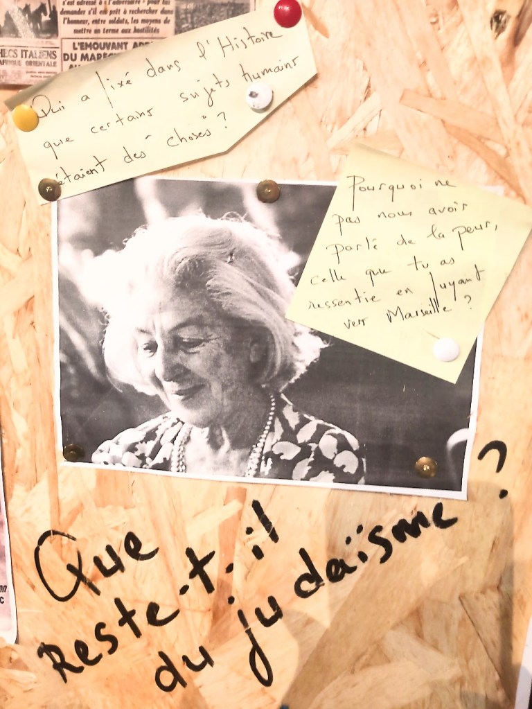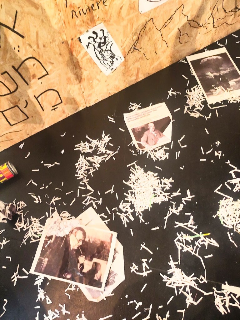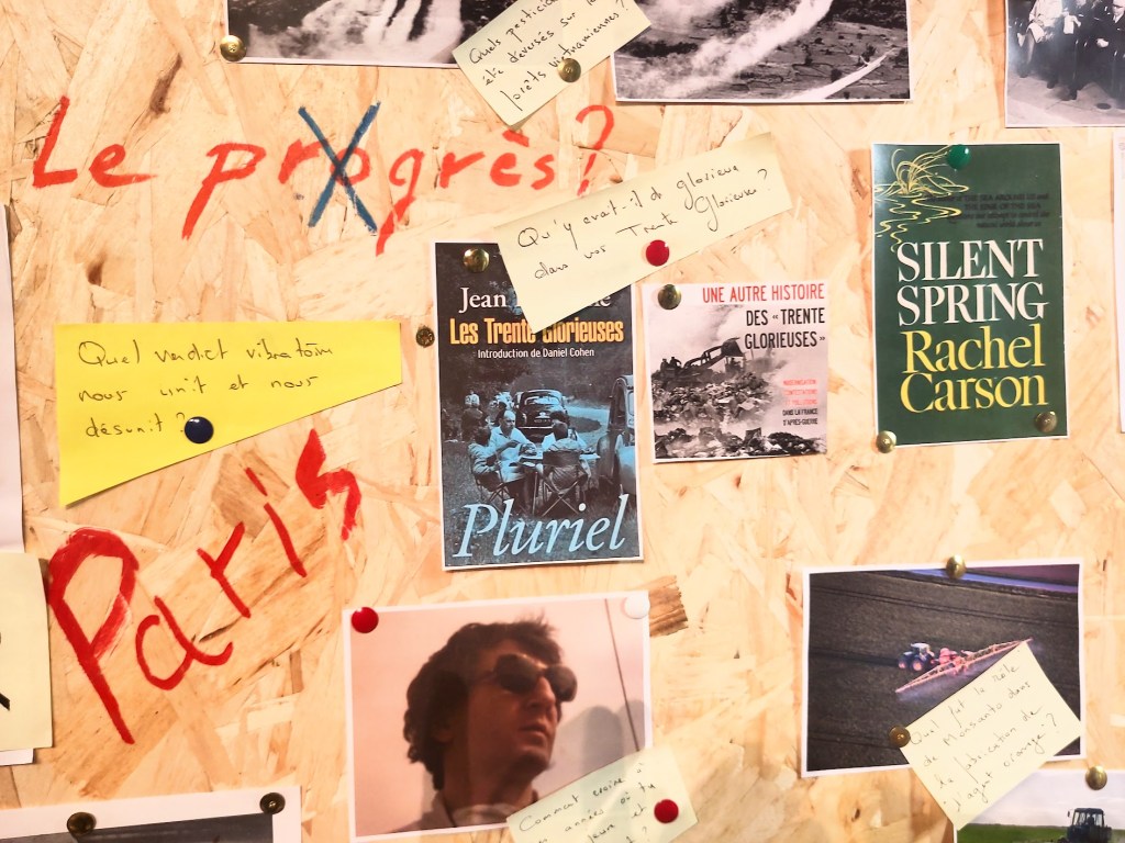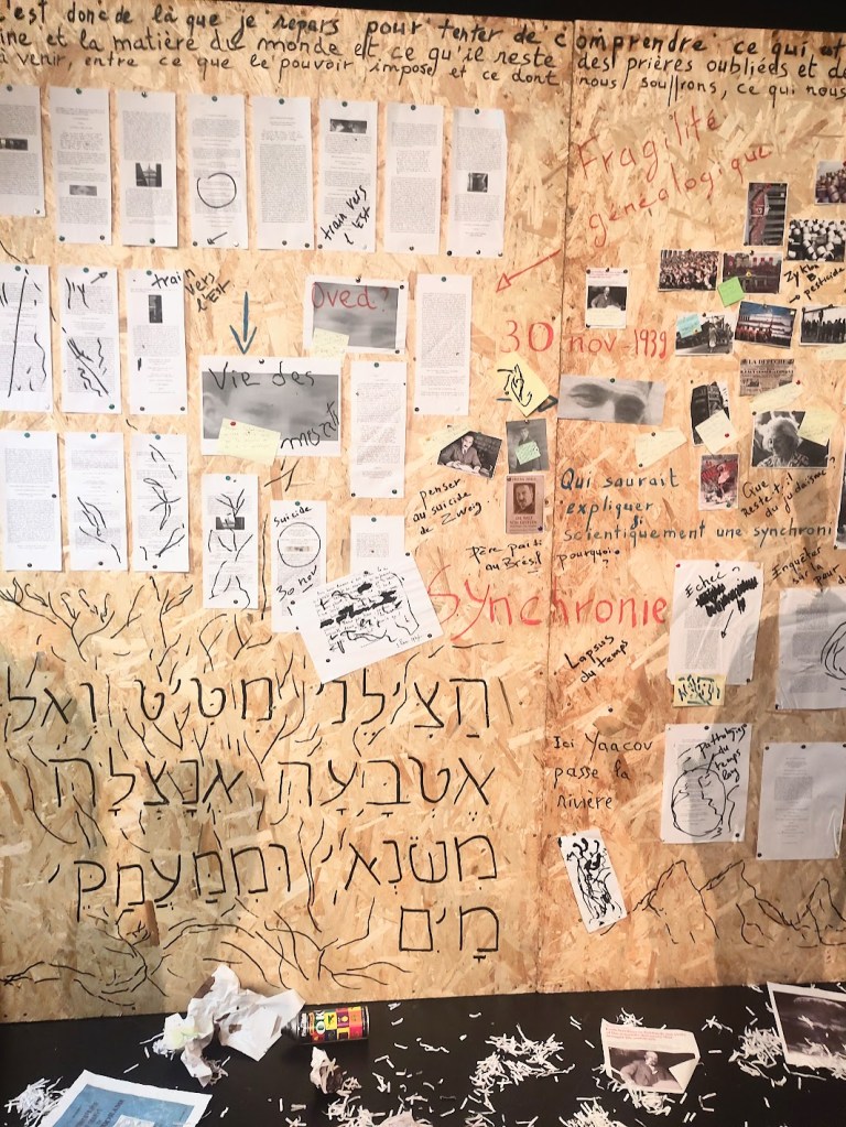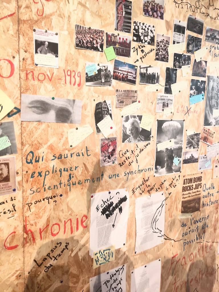 Dans la petite salle 76 du théâtre, l’écrivain et chercheur Camille de Toledo a installé, en forme de triptyque sur des panneaux de contreplaqué, le résultat matériel de son enquête. Ce sont les archives de son travail: photographies personnelles ou journalistiques, textes imprimés, phrases écrites manuellement. La voix de l’auteur témoigne également par un enregistrement. Tels que nous les voyons dans les séries policière, il a épinglé les points d’appui de son enquête, son cheminement mental dévoilé pour éclaircir autant qu’il lui est possible, le parcours de sa famille, lequel fait écho à celui, sociologique et politique, du XXe siècle.